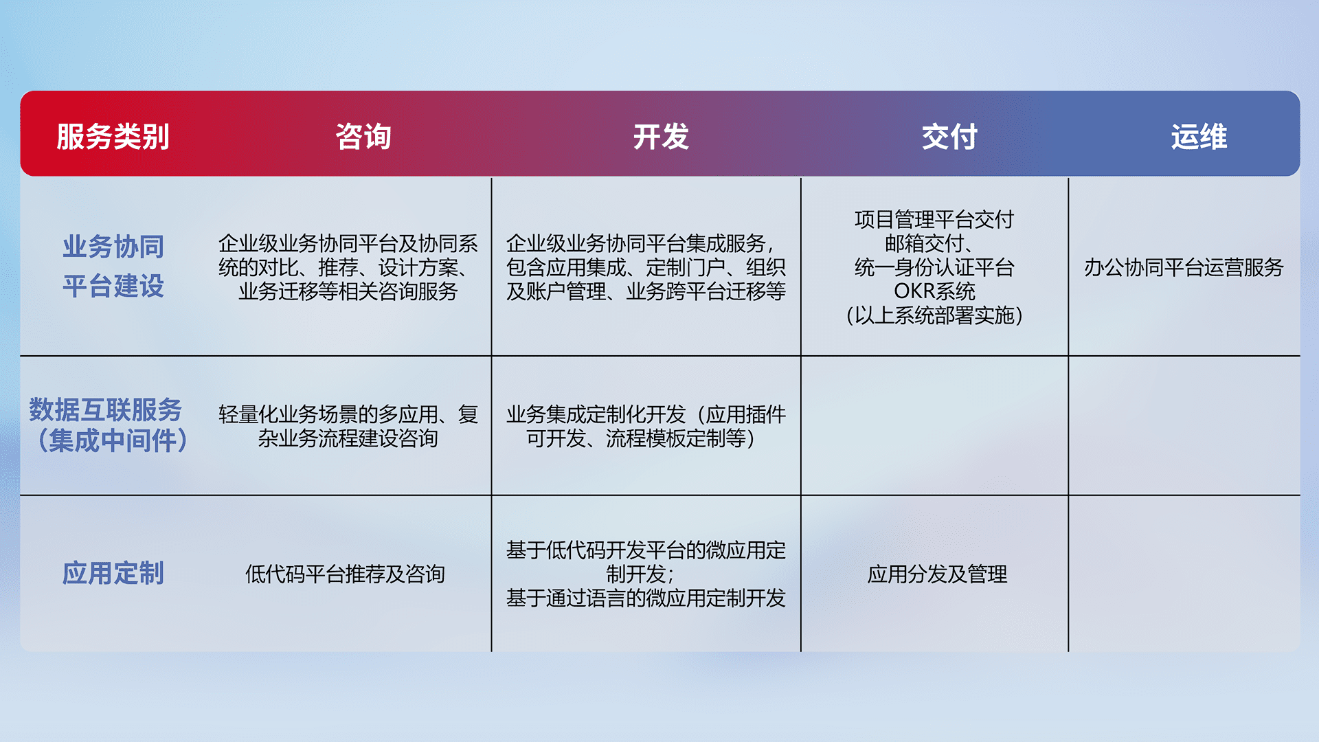 针对钉钉、、、企微、、、IDaas等平台级产品提供产品的规划、、、方案、、交付、、定制化开发等服务,,,,实现如统一协同办公、、、、智能客户服务、、、、混合会议管理、、、、智能数据查询、、、、等业务场景,,,实现数字化转型。。。。
